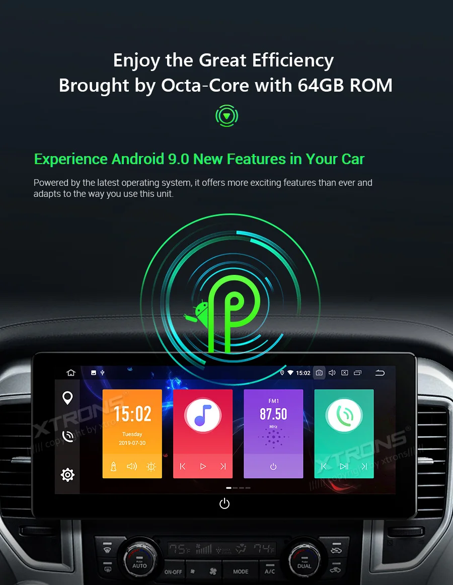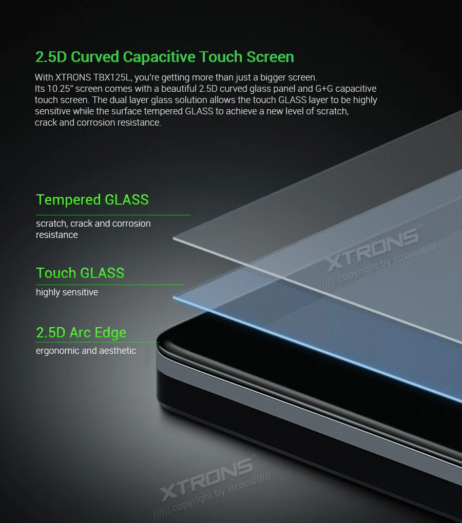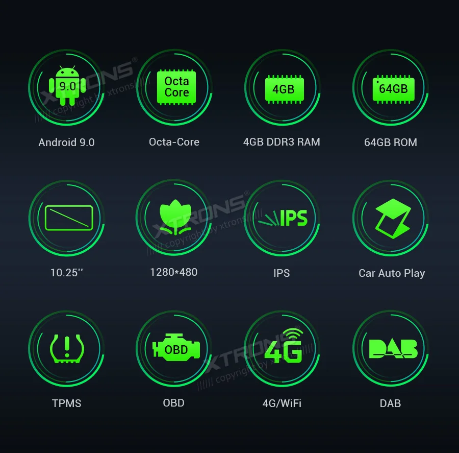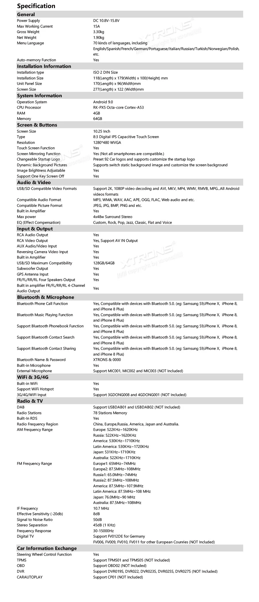 Note: This unit does NOT have a DVD drive. *Android 9.0 Operating System *64GB ROM, 4GB DDR3 RAM, Octa-Core ARM Cortex PX5 64Bit Processor *10.25 inch 2.5D curved capacitive touch screen, 1280*480 DPI super clear screen *178° adjustable viewing angel IPS/VA panel *Support car auto play *Support 3G/4G/Wi-Fi connection *Optional DAB function *Optional OBD function *Optional TPMS function *Support Bluetooth 5.0 for handsfree calls and music *Screen Mirroring Function *Steering wheel control *Support online/offline navigation *Support front/reversing camera input and DVR input *XTRONS UI, Redesigned back end *Built-in SD & USB Slot *Built-in radio tuner with 54FM/24AM preset *Optional Accessories to perfect your user Experience Optimal Performance with Octa-Core Processor By adopting the advanced and flexible CPU and GPU architecture, task and operation speed of the device have been greatly increased. The octa-core 64bit processor offers high-speed computing and enables multiple applications seamlessly running simultaneously without performance degradation, creating massive efficiencies and a drastically improved user experience. Boot Time <1s First Boot Time<20s Industrial Standard Hardware Equipped with the standard hardware in automotive industry, the head unit offers excellent stability and reliable performance. Bluetooth Module-- Detached Module--Better Bluetooth calling quality WiFi Module--Detached Module--Better signal receiving, anti-interference Radio Chip --NXP6686--Better radio signal receiving Amplifier Chip--TDA7851 --High-fidelity and powerful audio effects GPS Chip -- MG1613S--Accurate positioning 64GB ROM--Upgraded Storage / 4GB RAM --DDR3 memory Rockchip CPU --1.5GHz * 8 Core --64-bit Octa-core processor Power Supply--Sealed Inductor --Al Capacitors Compatible from 9V to 16V 2.5D Curved Capacitive Touch Screen With XTRONS TBX125L, you're getting more than just a bigger screen. Its 10.25'' screen comes with a beautiful 2.5D curved glass panel and G+G capacitive touch screen. The dual layer glass solution allows the touch GLASS layer to be highly sensitive while the surface tempered GLASS to achieve a new level of scratch crack and corrosion resistance. Tempered Glass --scretch, crack and corrosion resistance Touch GLASS layer -- Highly sensitive 2.5D Arc Edge -- ergonomic and aesthetic Clear Image From Any Angle Thanks to its IPS (In-Panel Switching) technology, the TBX125L makes it possible to enjoy viewing on a Big Screen stereo without eye fatigue or discomfort from any angle. Catch every single crisp, clear and vibrant picture from expansive 178° viewing angle. Keep yourself fully engaged in navigation maps or favorite videos. Adjustable Viewing Angles There are five different angles enable you to adjust the display angle to the optimal position. Once the desired screen position is determined, the screen and mount get fixed to the chassis for a sturdy fit and finish. Car Auto Play- A Smart Way to Use an iPhone in the Car Simply connect the optional XTRONS CP01 to your head unit and be amazed on how incredibly intuitive it becomes to connect your iPhone onto it its screen. Via the inbuilt zLink technology and its voice control function, everything is designed to bring the best out of your iPhone and establish a close connection with the head unit. The CP01 does not support Android phone. The CP01 supports iPhone 6 and later models with iOS 10 and later versions. The CP01 only works with XTRONS PA, PB, PE and PQ series unit running Android 8.0/8.1 and above. Note: TheCP01is not included. Need it, inquire with us now! •Extended Functions for more Enjoyable Use 1. DAB+ Enjoy the audiophile-level sound in your car XTRONS USBDAB01andUSBDAB02are compatible. Need it, inquire with us now! 2. TPMS Monitors your tire pressure and temperature XTRONSTPMS01/TPMS05are compatible. Need it, inquire with us now! 3.OBD2 A window for you to diagnose your car status XTRONSOBD02is compatible. Need it, inquire with us now! 4. MIC Makes the hands free Bluetooth easier and safer XTRONSMIC001&MIC002&MIC003are compatible. Need it, inquire with us now! 5.DVR Helps you record your journey on the road XTRONSDVR019S,DVR022,DVR023S, DVR025S,DVR027Sare compatible. Need it, inquire with us now! 6.KEYBOARD Makes the input of information on this car stereo easily XTRONSAMK003is compatible. Need it, inquire with us now! 7.4G Browse on the Internet with 3G/4G Dongle XTRONS4GDONG001and3GDONG008arecompatible, need it, inquire with us now! 8.CAMERA Ensure the safety of your driving XTRONSCAM005/CAM006/CAM007/CAM009/CAM001Fare compatible. Need it, inquire with us now! 9.Car Auto Play The best car connecting experience for iOS phone. XTRONS CP01is compatible. Need it, inquire with us now!