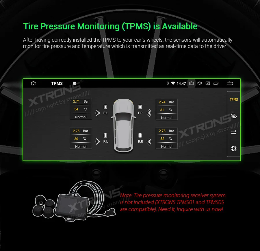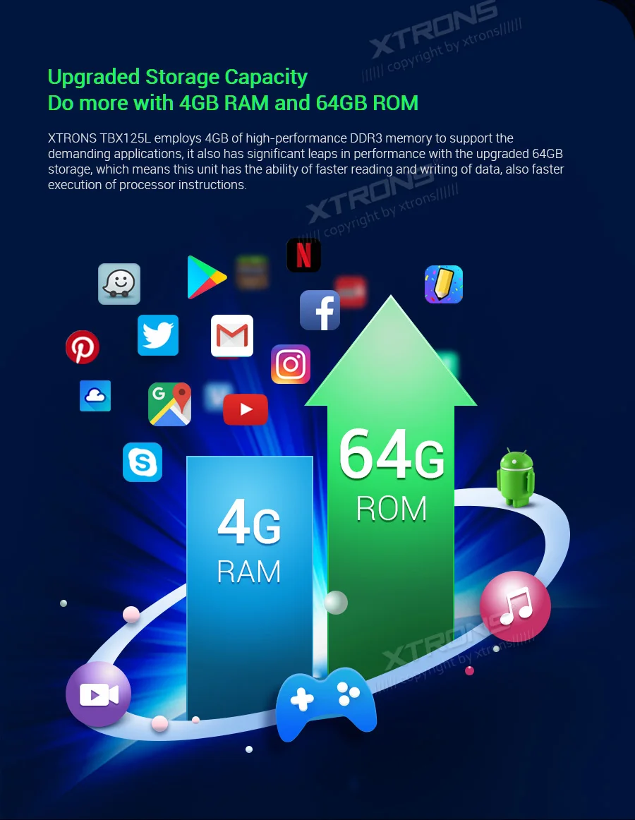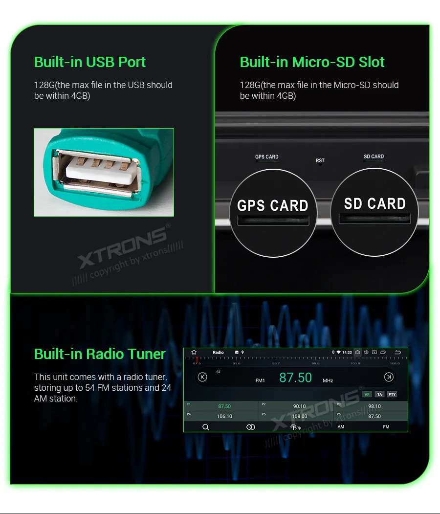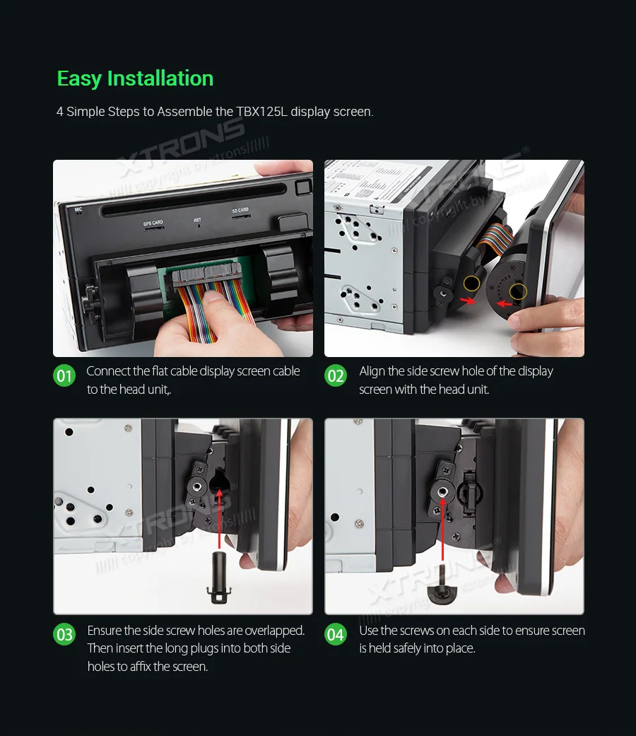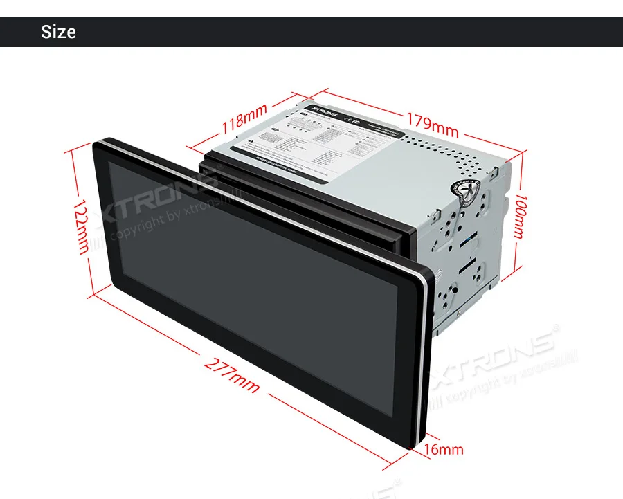 Note: This unit does NOT have a DVD drive. *Android 9.0 Operating System *64GB ROM, 4GB DDR3 RAM, Octa-Core ARM Cortex PX5 64Bit Processor *10.25 inch 2.5D curved capacitive touch screen, 1280*480 DPI super clear screen *178° adjustable viewing angel IPS/VA panel *Support car auto play *Support 3G/4G/Wi-Fi connection *Optional DAB function *Optional OBD function *Optional TPMS function *Support Bluetooth 5.0 for handsfree calls and music *Screen Mirroring Function *Steering wheel control *Support online/offline navigation *Support front/reversing camera input and DVR input *XTRONS UI, Redesigned back end *Built-in SD & USB Slot *Built-in radio tuner with 54FM/24AM preset *Optional Accessories to perfect your user Experience Optimal Performance with Octa-Core Processor By adopting the advanced and flexible CPU and GPU architecture, task and operation speed of the device have been greatly increased. The octa-core 64bit processor offers high-speed computing and enables multiple applications seamlessly running simultaneously without performance degradation, creating massive efficiencies and a drastically improved user experience. Boot Time <1s First Boot Time<20s Industrial Standard Hardware Equipped with the standard hardware in automotive industry, the head unit offers excellent stability and reliable performance. Bluetooth Module-- Detached Module--Better Bluetooth calling quality WiFi Module--Detached Module--Better signal receiving, anti-interference Radio Chip --NXP6686--Better radio signal receiving Amplifier Chip--TDA7851 --High-fidelity and powerful audio effects GPS Chip -- MG1613S--Accurate positioning 64GB ROM--Upgraded Storage / 4GB RAM --DDR3 memory Rockchip CPU --1.5GHz * 8 Core --64-bit Octa-core processor Power Supply--Sealed Inductor --Al Capacitors Compatible from 9V to 16V 2.5D Curved Capacitive Touch Screen With XTRONS TBX125L, you're getting more than just a bigger screen. Its 10.25'' screen comes with a beautiful 2.5D curved glass panel and G+G capacitive touch screen. The dual layer glass solution allows the touch GLASS layer to be highly sensitive while the surface tempered GLASS to achieve a new level of scratch crack and corrosion resistance. Tempered Glass --scretch, crack and corrosion resistance Touch GLASS layer -- Highly sensitive 2.5D Arc Edge -- ergonomic and aesthetic Clear Image From Any Angle Thanks to its IPS (In-Panel Switching) technology, the TBX125L makes it possible to enjoy viewing on a Big Screen stereo without eye fatigue or discomfort from any angle. Catch every single crisp, clear and vibrant picture from expansive 178° viewing angle. Keep yourself fully engaged in navigation maps or favorite videos. Adjustable Viewing Angles There are five different angles enable you to adjust the display angle to the optimal position. Once the desired screen position is determined, the screen and mount get fixed to the chassis for a sturdy fit and finish. Car Auto Play- A Smart Way to Use an iPhone in the Car Simply connect the optional XTRONS CP01 to your head unit and be amazed on how incredibly intuitive it becomes to connect your iPhone onto it its screen. Via the inbuilt zLink technology and its voice control function, everything is designed to bring the best out of your iPhone and establish a close connection with the head unit. The CP01 does not support Android phone. The CP01 supports iPhone 6 and later models with iOS 10 and later versions. The CP01 only works with XTRONS PA, PB, PE and PQ series unit running Android 8.0/8.1 and above. Note: TheCP01is not included. Need it, inquire with us now! •Extended Functions for more Enjoyable Use 1. DAB+ Enjoy the audiophile-level sound in your car XTRONS USBDAB01andUSBDAB02are compatible. Need it, inquire with us now! 2. TPMS Monitors your tire pressure and temperature XTRONSTPMS01/TPMS05are compatible. Need it, inquire with us now! 3.OBD2 A window for you to diagnose your car status XTRONSOBD02is compatible. Need it, inquire with us now! 4. MIC Makes the hands free Bluetooth easier and safer XTRONSMIC001&MIC002&MIC003are compatible. Need it, inquire with us now! 5.DVR Helps you record your journey on the road XTRONSDVR019S,DVR022,DVR023S, DVR025S,DVR027Sare compatible. Need it, inquire with us now! 6.KEYBOARD Makes the input of information on this car stereo easily XTRONSAMK003is compatible. Need it, inquire with us now! 7.4G Browse on the Internet with 3G/4G Dongle XTRONS4GDONG001and3GDONG008arecompatible, need it, inquire with us now! 8.CAMERA Ensure the safety of your driving XTRONSCAM005/CAM006/CAM007/CAM009/CAM001Fare compatible. Need it, inquire with us now! 9.Car Auto Play The best car connecting experience for iOS phone. XTRONS CP01is compatible. Need it, inquire with us now!